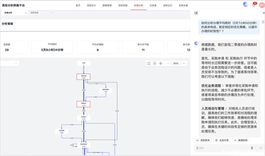 基于AI的流程挖掘技术,分析流程事件数据,识别瓶颈、偏差和低效环节,提供可视化流程模型
