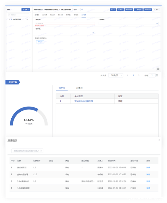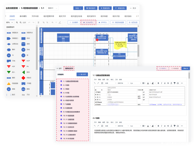 支持制度、标准、指导书等多种体系文件的结构化条款以及与流程关联融合管理
