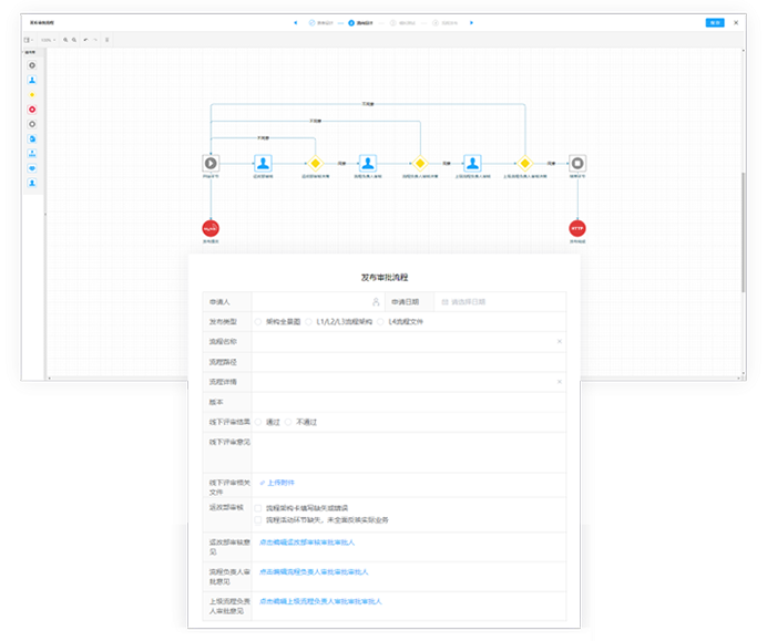适配企业不同的管理要求,不需要代码开发, 通过配置即可实现流程属性和要素内容自定义配置