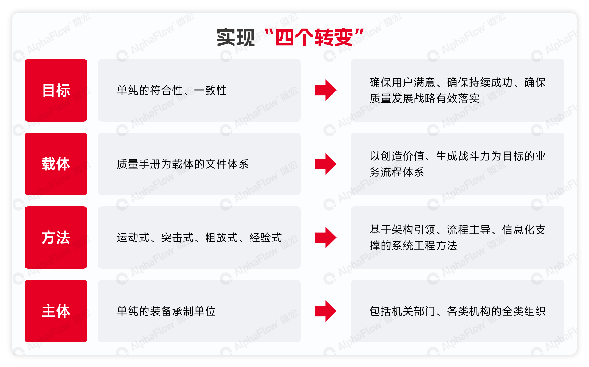 NQMS以“架构引领、流程主导、要素融合、信息化支撑”为核心理念,目标是将质量管理的方针、规则、标准等要求有机融入流程体系;将质量管理的方法嵌入到业务活动中;将质量管理的资源有效配置到管理体系内,通过质量管理与组织管理的结合实现“四个转变”。