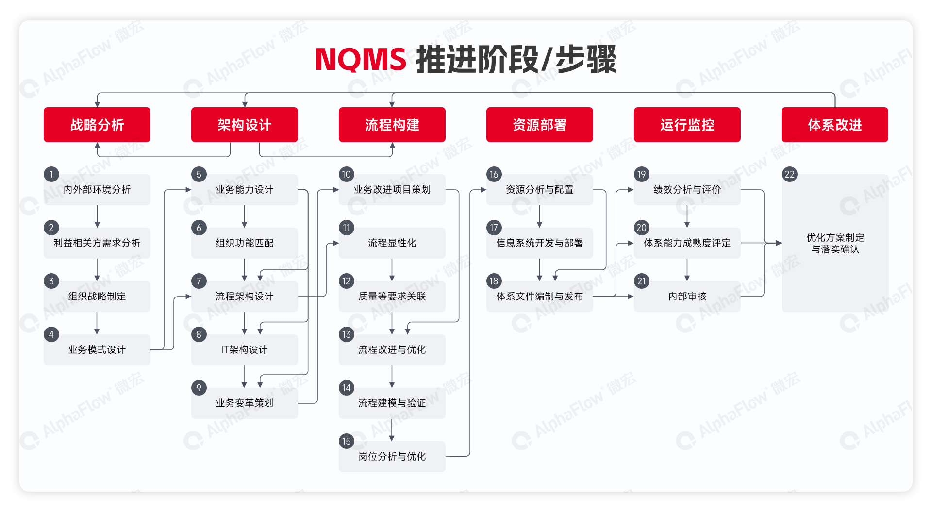 该体系将组织质量管理体系的分析、设计、验证、执行、优化全过程,细分为战略分析、架构设计、流程构建、资源部署、运行监控与体系改进“六阶段”“22 步骤”。最终通过六阶段的不断迭代和循环,实现军工企业质量管理全生命周期的闭环控制。